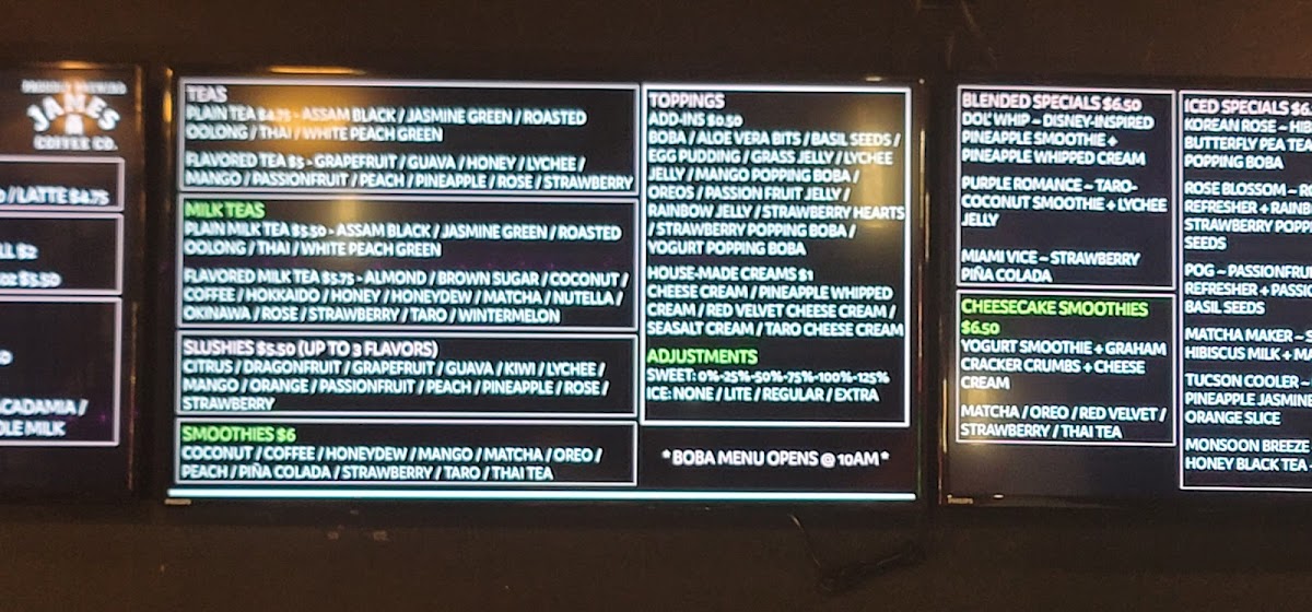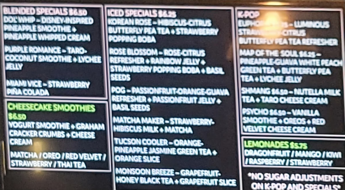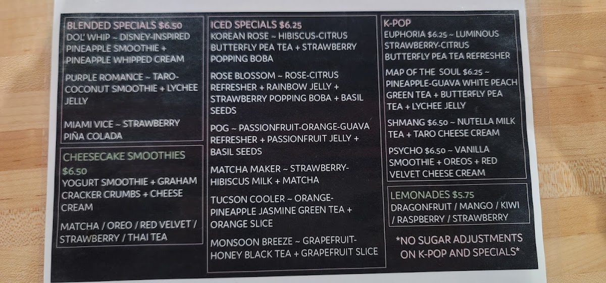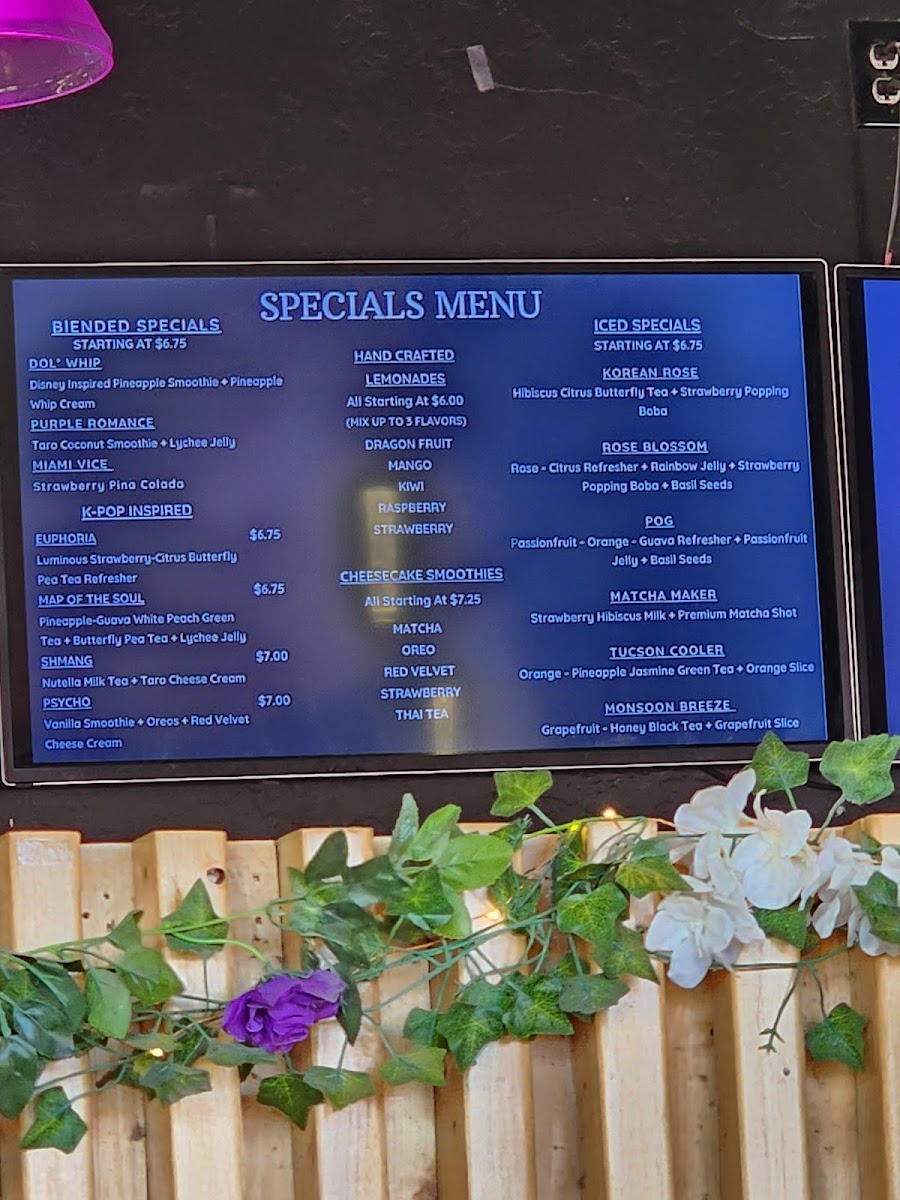 Welcome to The Korean Rose, a delightful gem located at 6118 E Speedway Blvd in Tucson, AZ. This charming spot invites you to unwind with friends or immerse yourself in study, thanks to its cozy vibe and beautifully curated decor. The menu offers a variety of basic teas, including Jasmine Green and Oolong, each priced at just $5.00. For something creative, dive into the KPOP SERIES, where drinks like "Psycho" and "Euphoria" tantalize your taste buds for $6.75 to $7.00.